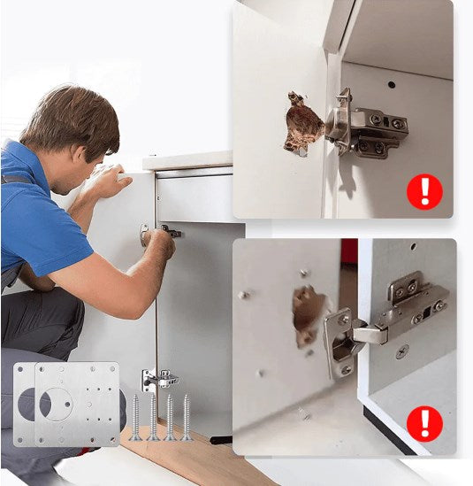 - Il n'est pas nécessaire de réinstaller ou d'acheter une nouvelle charnière. Le grand trou dans la plaque de réparation permet de recouvrir le bois endommagé lorsque la charnière sort complètement du boîtier de l'armoire. Sauvez vos coûteuses portes d'armoire en bois massif et tout meuble équipé d'une charnière.