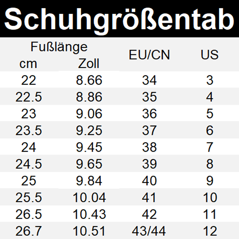 Wir empfehlen, das Produkt beim ersten Tragen 2–3 Stunden lang zu tragen, damit sich das PU-Material an die Fußform anpassen kann.