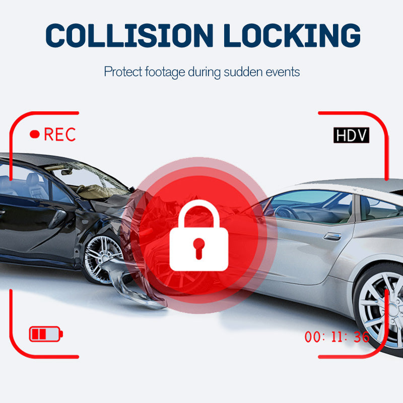 VERROUILLAGE D'URGENCE EN CAS DE COLLISION: Protégez les images critiques en cas d'urgence. Le capteur de gravité 3 axes intégré verrouille les enregistrements lorsqu'il détecte une collision ou un freinage brusque, empêchant ainsi l'écrasement des images.